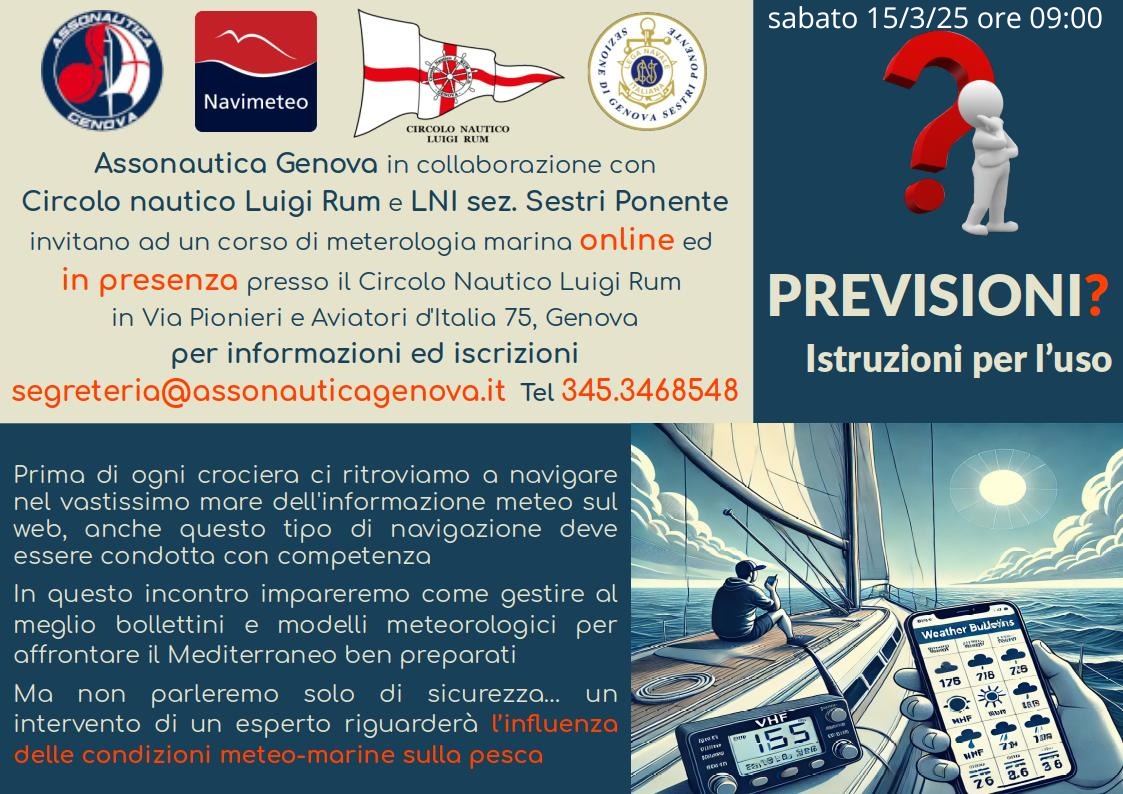Se hai a cuore la sicurezza in mare o vuoi sapere come le condizioni meteo marine influenzano la pesca partecipa al corso di meteorologia marina che Assonautica Genova organizza in collaborazione con Navimeteo, il circolo nautico Luigi Rum e la lni sezione di Sestri Ponente. Per informazioni e/o iscrizioni contattaci per email segreteria@assonauticagenova.it o telefonicamente 3453468548. scarica qui il modulo di iscrizione